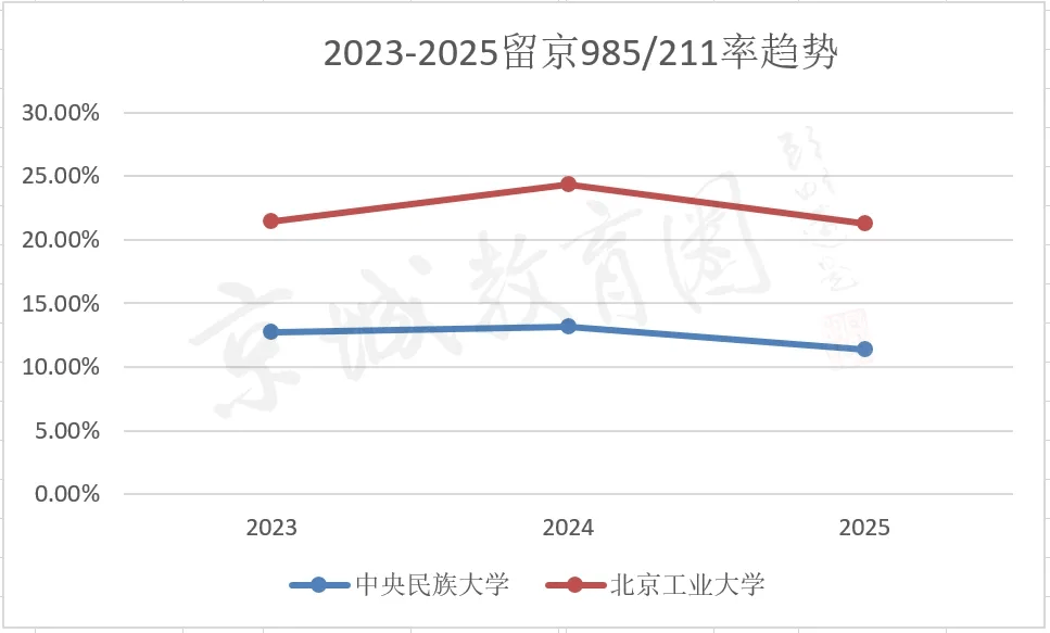 中央民族大学、以及关注度较高的北京工业大学录取数据,发现北京985/211的门槛变高了。(注:统计未含中外合作办学,以及北体、北京中医药大学等专业类院校。)换句线率出现“双降”。