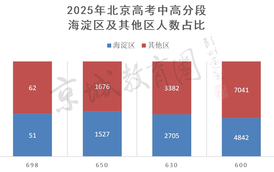 这些数据充分说明,海淀区高分段考生数量在北京占据绝对优势,尤其是650分以上分段,占比接近一半。