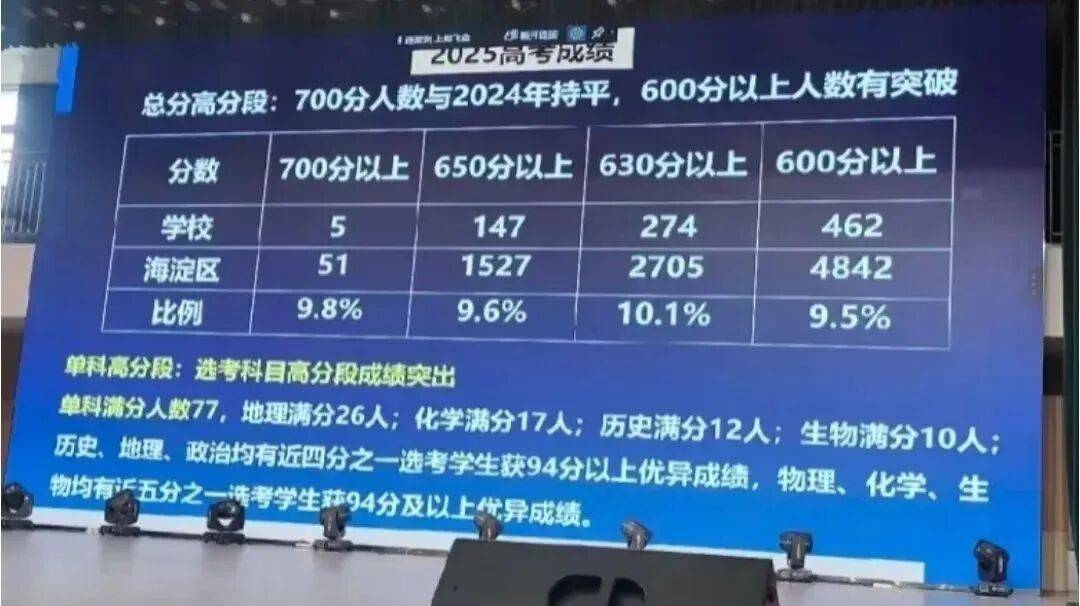 近日,海淀某顶尖高中家长会流出一份2025年海淀高考成绩数据图,可信度较高。