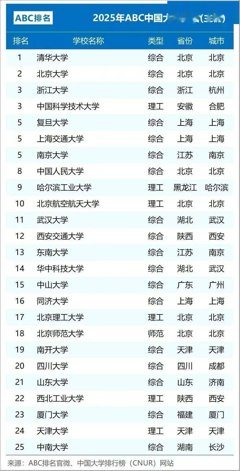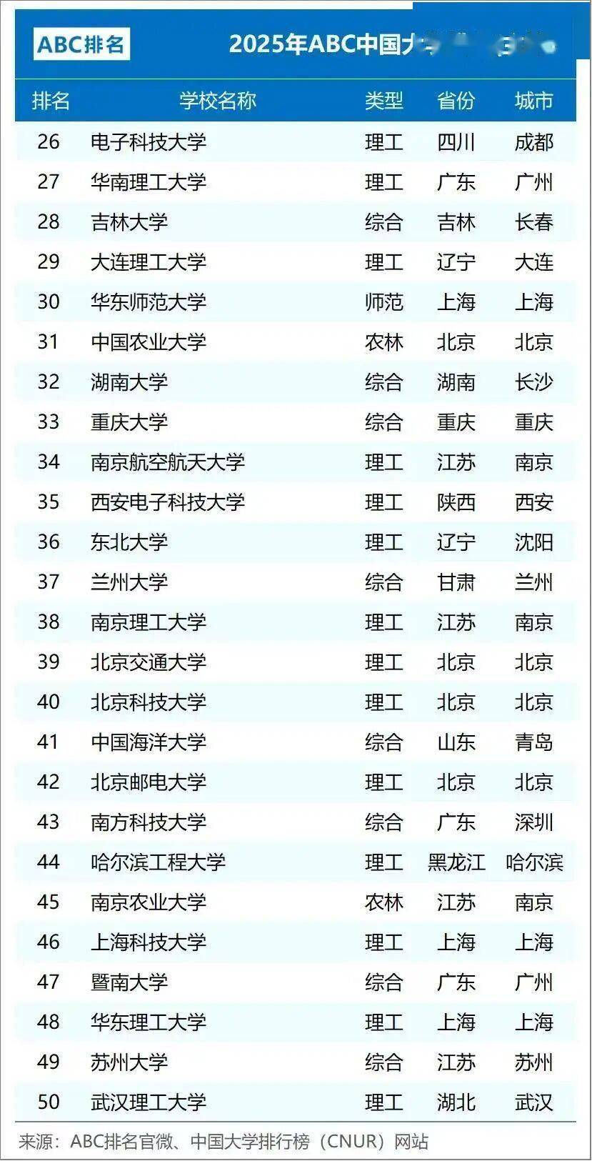 2025年ABC中国大学排名(主榜)50强中,榜上有名的几乎都是985、211名校资源,下面就来具体看看。