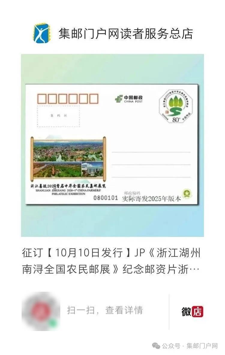 集邮门户网讯由中华全国集邮联合会、湖州市人民政府主办,浙江省集邮协会、湖州市南浔区人民政府承办的第三届全国农民邮展,将于2025年10月10-12日在湖州市南浔区善琏镇举行。本届邮展为主题性全国邮展,竞赛性展品设传统、邮政历史、邮政用品、专题、极限、青少年、图画明信片、一框(可展出1-4框)、现代、开放、试验(含原地和首日封子类)等11个类别。28个省级和全国行业集邮协会共申报了180部551框邮集展品。集邮门户网了解到经全国集邮联审定,伟德国际最终有145部445框邮集被接受参展。为此,中国邮政10月10日发行JP《第三届全国农民邮展》纪念邮资片一套1枚,集邮门户网看到与同日发行的《故宫博物院成立100周年》纪念邮票是双首日。