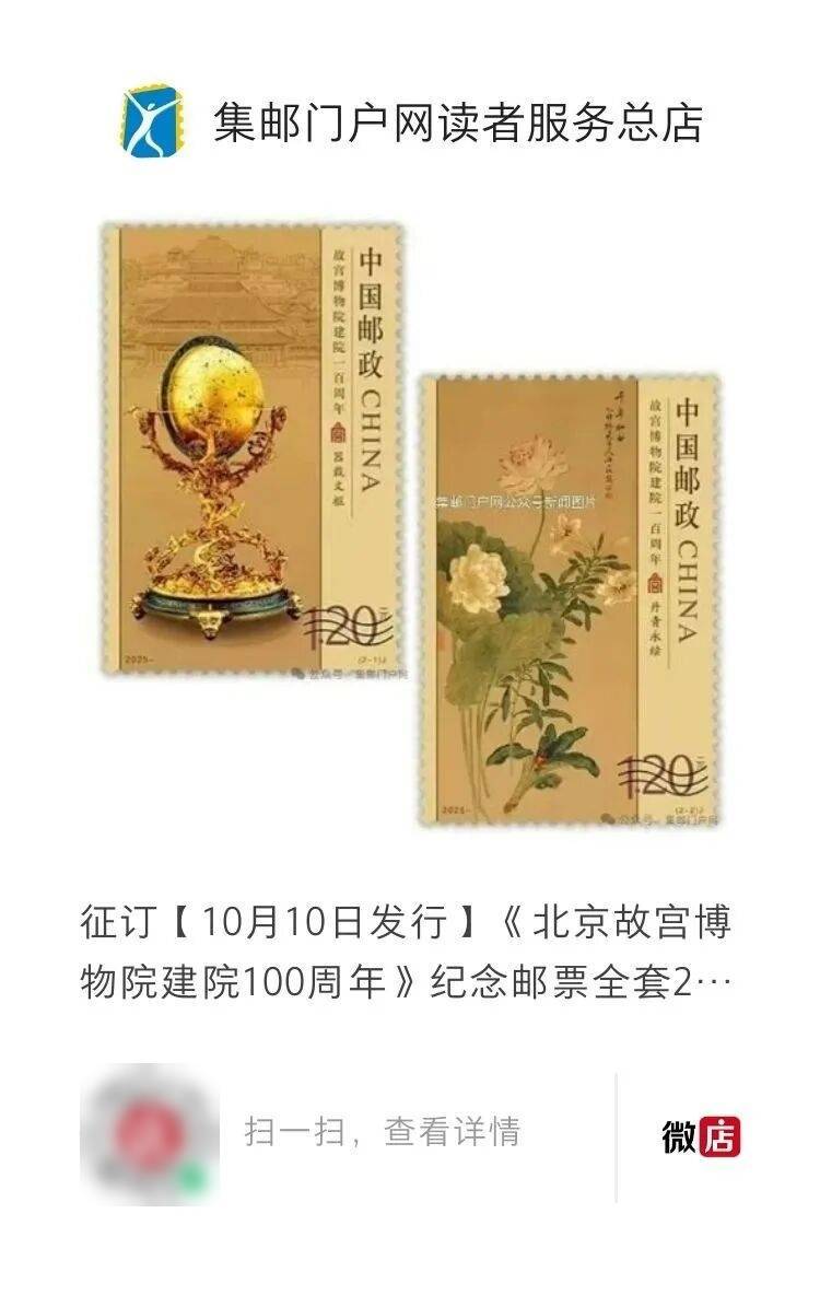 集邮门户网晚间快讯 中国邮政定于2025年10月10日发行《故宫博物院成立100周年》纪念邮票全套2枚,面值1.2元、1.2元。是否发行小版张请关注集邮门户网进一步消息。